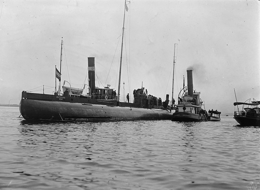 Az elsőként elkészülő DEUTSCHLAND parancsnokának Paul König-et nevezték ki, aki korábban a német kereskedelmi flottánál szolgált hajókapitányként, de az új megbízatása mellé tartalékos sorhajóhadnagyi rangot is kapott. Első útjukra 1916. június 23-án futottak ki 750 tonna rakománnyal, melyből 125 tonna kémiai festőanyagokat tett ki. Ezen kívül gyógyszereket, drágaköveket, és postai küldeményeket vitt magával. 1916. július 9-én érkeztek meg Baltimore-ba (más források szerint július 7-én). A DEUTSCHLAND kapitányát és személyzetét hősökként köszöntötték, és újságírók hada ostromolta tartózkodásuk során. Egymást érték a vacsorameghívások és az üdvözlések, leginkább a német származású lakosság részéről. Egyesek több száz kilómétert is hajlandóak voltak utazni, csak hogy találkozhassanak a tengerészekkel. A DEUTSCHLAND-ot a modern tengeralattjáró egyik atyja, Simon Lake is megtekintette, és megállapodott a Nord Deutsche Loyd képviselőivel, hogy kereskedelmi tengeralattjárókat épít a számukra, de ebből végül semmi sem valósult meg.