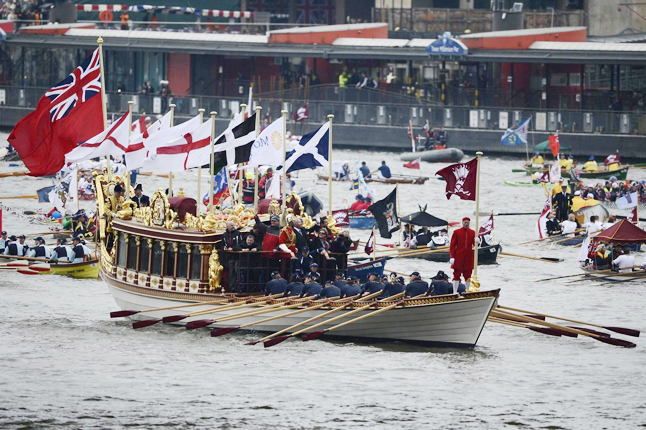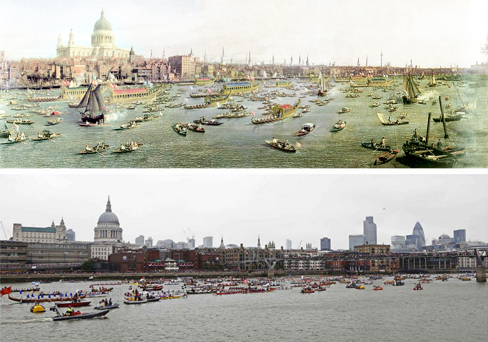 London régen és most. Fent: "A Temze Lord Major Napján", Canaletto 1747 – Lobkowitz Gyűjtemény, Csehország (forrás: REUTERS, http://news.nationalpost.com/2012/06/03/diamond-jubilee-pageant/). Lent: A gyémánt jubileumi hajós felvonulás, 2012.