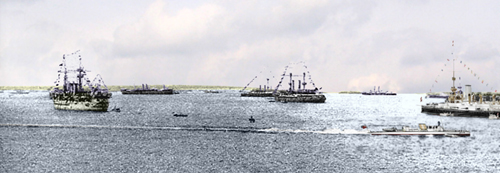 A TURBINIA (1894) keresztülvágtat az összegyűlt hajók sorfalán (a képen éppen a WIEN csatahajó előtt) az 1897. évi Gyémánt Jubileumi Flottaparádén (utánszínezte: dr. Balogh Tamás)