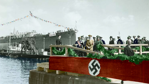 Horthy Miklós kormányzó Kielben. Fent a PRINZ EUGEN nehézcirkáló vízrebocsátásakor