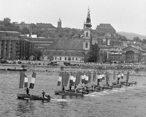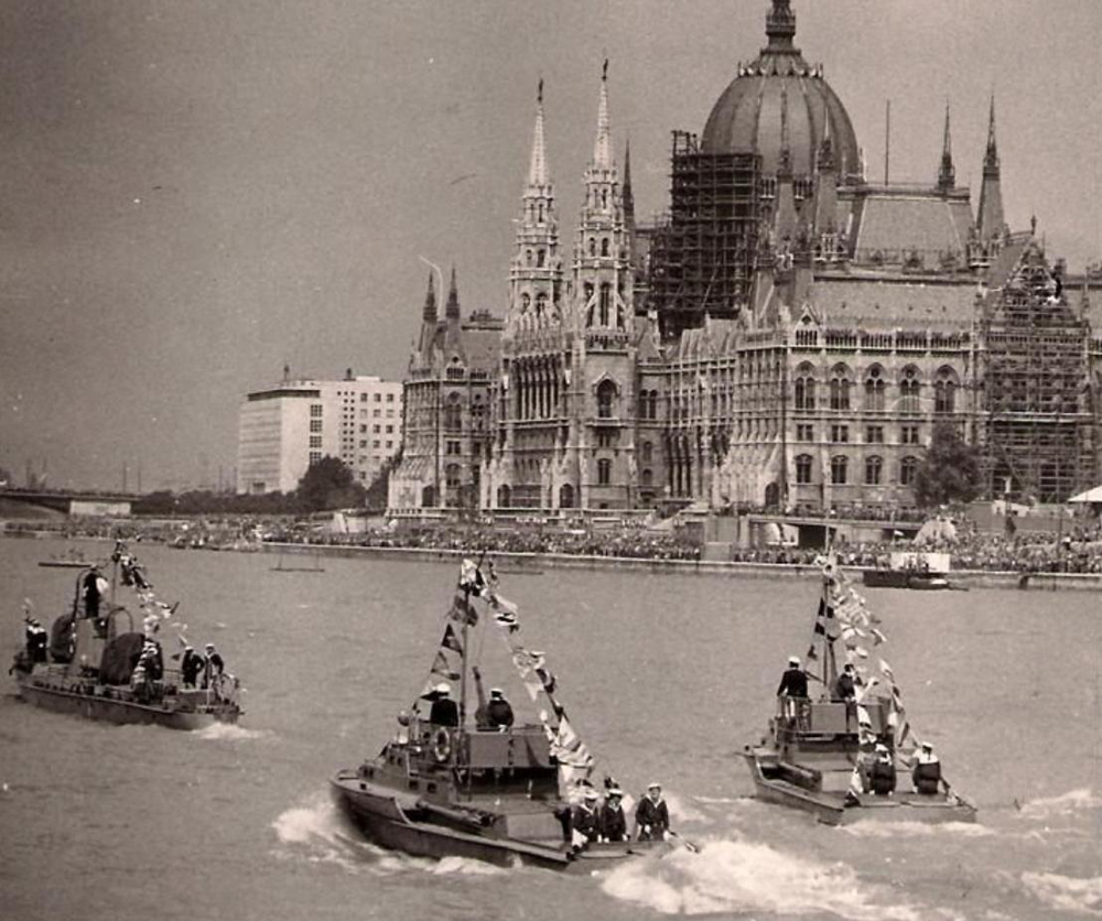 Augusztus 20. 1960-ban (fent) a Néphadsereg Hadihajós Osztály lobogódíszt viselő aknásznaszádjaival és 1978-ban (lent) zászlókkal díszített rohamcsónakokkal.