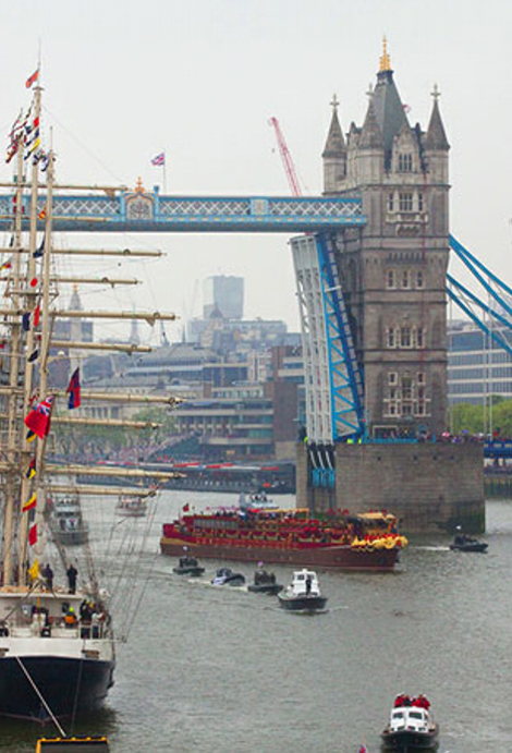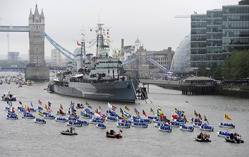 A "szabadidő-hajók" és a Nemzetközösségi tagállamok lobogóit hordozó tengerészkadétok elhaladnak az HMS BELFAST könnyűcirkáló (1939) előtt.Csaknem 700 hajó lepte el a Temzét Londonban, ehhez jött még a kb. 200 biztosító- és irányító feladatot ellátó bárka és motoros, vagyis mindösszesen mintegy 1 000 különféle vízi jármű. A különböző csoportokba osztott hajók minden szakasza élén egy "hírnök uszály" haladt. Ezek közül az első egy úszó harangláb volt, amelyen a Whitechapell Bell öntöde 8 új (külön erre az alkalomra készített) harangja kongott. Hangjukra a folyóparti templomok harangkórusa válaszolt. A 14 híd alatt áthaladó parádé - amelyben a királynő is részt vett - csaknem három óra hosszat tartott. A 85 éves uralkodónő és 91 éves férje, bár egy-egy kényelmes szék is a rendelkezésükre állt, egész idő alatt álltak a rendelkezésükre bocsátott hajó fedélzetén. A britek lelkesedése határtalan volt. A BBC News internetes adásán élőben volt követhető a több helyszínről jelentkező közvetítés. A műsorban megkérdezett egyik bámészkodó - egy fekete afrikai apuka és a kislánya - arra a kérdésre, hogy miért jöttek el, magától értetődő természetességgel válaszolták: "Mert ez a MI történelmünk része". Közben az egyik afganisztáni brit katonai támaszpontot kapcsolták, ahol a legénység szintén a jubileum megünneplésére készült: rezesbanda játszotta a "Rule Britannia"-t. A szomszédos Pakisztánban - a Nemzetközösség egyik tagállamában - a gyermekek Union Jack-et festettek az arcukra (akár egy futballmeccs szurkolói), s úgy köszöntötték a királynőt, a Monarchiát és Britanniát. A britek és a londoniak többsége velük értett egyet: a Hammersmithben "Ne ünnepeljük EZT!" feliratú transzparensekkel a monarchia intézménye ellen protestáló brit republikánusok maroknyi csoportja jórészt észrevétlen maradt. IV. Feltámad a tradíció? II. Erzsébet, Nagy-Britannia és Észak-Írország Egyesült Királysága, s a Nemzetközösségi Királyságok királynője uralkodói gyémánt jubileumának (60. évfordulójának) június 5-én tartott ünnepi rendezvényein Csák János, Magyarország londoni nagykövete képviselte a magyar kormányt. A Temzén rendezett hajós felvonuláson - bár a királynőnek erdélyi magyar gyökerei is vannak (ükanyja Rhédey Claudina grófnő) - magyar hajó nem vett részt. Pedig a bemutatott magyar katonai hagyományok alapján Magyarország akár hadihajós alakulatot is küldhetett volna. Hogyan lehetséges ez? Nos, épp' a hajós felvonulás választott módja - folyami jellege - a válasz erre. Hisz' 2012-ben épp' 145 esztendeje annak a forradalmi jelentőségű magyar hajóútnak, amely története során elsőként szelte át vízi úton az európai kontinenst, bizonyítva ezzel, hogy lehetséges állandó hajójárat kialakítása a Fekete-tenger és az Atlanti-óceán között! Az utazás tervezője és kivitelezője Széchenyi Ödön[6] gróf volt, aki HABLEÁNY nevű gőzhajóján kelt át a kontinensen 1867. április 6. - május 18. között. A felkészülést már 1861-ben elkezdte, amikor a Duna-gőzhajózási Társaság HILDEGARD nevű hajóján és a FRANZ JOSEPH gyorsgőzösön gyakorolt (háromszor járt a Pest-Galac útvonalon, hogy kapitányi, kormányosi, gépészi és vízrajzi gyakorlatot szerezzen). Gépészeti ismereteit Vész Ármin műegyetemi tanár, hajózási ismereteit pedig Kenessey Albert[7] hajóskapitány segített elmélyíteni.
