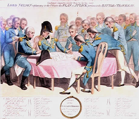 A két férfi nem régóta ismerte egymást: először 1803 júliusában találkoztak, amikor Nelson átvette a Földközi-tengeri Flotta parancsnokságát. Azonban hamar tisztelet ébredt bennük a másik iránt, s alig egy év múlva Nelson már azt írta közös barátjuknak, Clarence hercegének: "...minél régebb óta ismerem, annál kiválóbb tulajdonságait fedezem fel, nem csak mint tengerésztisztnek, de mint embernek is, aki tisztában van a világ dolgaival." [1] 1805-re Keats lett Nelson egyik legbizalmasabb beosztottja, s amint a két ember együtt sétált a mertoni udvaron, Nelson elkezdte magyarázni, hogyan tervezi megvívni következő csatáját, mely bármikor bekövetkezhetett. Sok évvel később, 1829-ben, Keats elmesélte ezt az emlékezetes sétát Edward Hawke Lockernek, a tengerész anekdoták szorgalmas gyűjtőjének, aki végül így jegyezte le: "...[Nelson] azt mondta: »egyetlen nap sem lehet elég hosszú két flotta összerendezésére és döntő csata megvívására a régi módszer szerint... A flottát három részre osztva három oszlopot fogok formálni. Az egyik oszlop a tizenkét vagy tizennégy leggyorsabb, két ütegfedélzetes hajóból fog állni, melyeket végig a szél felőli oldalon fogok tartani, vagy előretolt helyzetben egy tiszt irányítása alá helyezve, akiről biztosan tudom, hogy véghez viszi az általam elképzelteket, ha lehetséges. Elgondolásom szerint így mindig kezemben lesz a döntés, hogy ott vessem harcba őket, ahol csak akarom... A flotta két oszlopot formáló maradék részével, ha tudom, vonaluk legelső hajójától számított egyharmadánál, egyszerre támadom meg őket. Azután azt mondta: Mit gondol erről? Egy ilyen kérdést úgy éreztem meg kell fontolni. Hallgattam. Ezt látva így szólt: De elmondom Önnek, hogy én mit gondolok erről. Úgy vélem, ez majd meglepi és összezavarja az ellenséget. Nem fogják tudni mire készülök. Az egész egy zűrzavaros csatába fog torkollani és ez az amit akarok."[2] Nem Keats volt az egyetlen ember, akinek Nelson kifejtette készülődő tervét. Pár nappal később hasonlóképp ismertette a tervet barátjával Lord Sidmouth-val (a korábbi Henry Addington miniszterelnök) és ujjaival egy kis asztal lapjára felvázolva, ezúttal kézzel foghatóan is szemléltette elgondolásait. Sidmouth (aki mint relikviát, megőrízte az asztalt) később úgy emlékezett vissza, hogy Nelson megjegyezte, "Rodney egy ponton törte át a vonalat, én két helyen fogom." [3] A leghíresebb eset az, amikor Nelson, a Victory nagy kabinjában, összehívott kapitányainak ecsetelte a tervet szeptember 29-én vacsora után, (lásd 2. kép) így számolva be a hatásról Emma Hamiltonnak "...olyan volt mint egy áramütés, néhányan örömkönnyeket hullattak, s mindenki egyetértett..."[4]