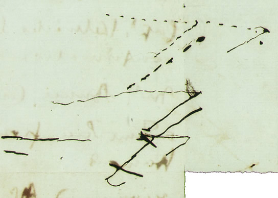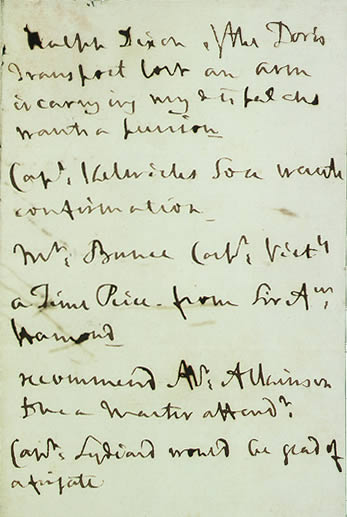 Valószínűnek tűnik, hogy ezek a lefirkantott emlékeztetők előléptetésekre és megkülönböztetett bánásmódra vonatkoznak, melyeket Nelson kieszközölni remélt néhány pártfogoltjának, s azoknak, akik vele szolgáltak a Victory-n az 1803-1805 közötti földközi-tengeri hadjárat során. A "Ralph Dixon" nevű személy ezidáig még nem nyert azonosítást. [11] "Kelwick kapitány" majdhogynem bizonyosan Edward Killiwick kapitány, aki a Földközi-tengeren szolgált Nelsonnal Livorno blokádja során, a Sardine parancsnokaként, 1796 nyarán. [12] Killiwick 1802-ben meghalt és Nelson nyilvánvalóan figyelemmel kísérte fia karrierjét - jóllehet, végül az ifjú John Killiwicknek 1807 szeptemberéig kellett várnia hadnagyi kinevezése jóváhagyásáig. "Mr. Bunce" nem más, mint William Bunce, a Victory hajóácsa, és "Mr. Atkinson" az a Thomas Atkinson, aki a Victory navigátora [13] volt az 1803-1805 közötti hadjáratban. "Sir Aw. Hamond" megegyezik Sir Andrew Snape Hammonddal, Nelson egy régi barátjával, aki 1805-ben haditengerészeti főszámvevő [14] volt. Végül "Lydiard kapitány" nem más, mint Charles Lydiard kapitány, aki egyike volt Nelson hadnagyainak az HMS Captain-en 1796-ban, s akit az HMS Anson fregatt parancsnokává neveztek ki 1805 decemberében, alighanem Nelson beavatkozásának eredményekép- pen. Habár a levél keltezetlen, e nevek egy helyen való szereplése azt sugalmazza, hogy a feljegyzés 1805-ben kellett íródjon, s e feltételezést alátámasztja a kézírás szakértő általi vizsgálata, mely megerősíti, hogy az hasonló más, Nelson által, élete utolsó éveiben írt dokumentumokéhoz. [15] Lehetséges, hogy az effajta feljegyzések a Victory fedélzetén íródtak, mégpedig Nelson titkárának, aki a napi levelek előkészítésekor használta fel azokat. Akárhogy is, egyetlen levél sem maradt fenn a Nelson-iratok között vagy a leveleskönyvekben ezen előléptetések és kinevezések bármelyikével kapcsolatban. Éppen ezért elfogadhatónak tűnik, hogy ezek a feljegyzések valóban egyfajta emlékeztetők gyanánt vétettek papírra, Nelsonnak, az Admiralitáson vagy a Haditengerészeti Testületnél való gyakori találkozóinak egyike előtt, 1805 augusztusi/szeptemberi eltávozása idején. A feljegyzések önmagukban is lenyűgözőek, mivel betekintést nyújtanak abba, milyen volt a nelsoni pártfogás, hogyan gondoskodott Nelson pártfogoltjairól. Például, az "időmérő" [16] igénye Bunce részére nagyon jellemző dolog; akárcsak jóindulatú érdeklődése egy régi harcostársának fia iránt, akivel közel tíz évvel korábban csak egy rövid ideig szolgált együtt. Mindenesetre a cetli hátoldala a legérdekesebb. Ezen egy meglehetősen hevenyészett vázlat látható, és erős a bizonyság, hogy ez az ábra ugyanazt a harceljárást szemlélteti, melyet Nelson Keats-nek és Lord Sidmouth-nak fejtett ki 1805 őszén - majd később ismét, ezúttal kapitányainak, Cadiznál. (lásd 4. kép) A vázlat két részben látható, a kettő közötti osztást vékony vonal jelöli. Az alsó félben az ellenséges flottát egy vastag rézsútos vonal jeleníti meg. A brit flotta először három oszlopba formálódva látható a papír bal oldalán, majd ahogyan két ponton átvágja az ellenséges csatasort, miközben a harmadik oszlopot az ellenséges vonal "tartalmazza", azzal párhuzamosan húzódva. Még a szenvedély is érezhető, mellyel Nelson az ellenség vonala centrumának átvágását szemlélteti - tolla mélyen a papírba vág és a tinta vastagon árad.