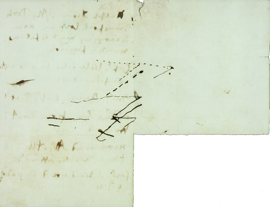Nelson e szóbeli eligazítás után, október 9-i dátummal, egy részletes írott memorandumot készített, s habár az ún. "Trafalgar Memorandum" kisebb részletkérdésekben eltér a tervtől, melyet Keats-nek felvázolt, lényege ugyanaz volt. Ebben egy három oszloppal végrehajtott támadással számolt, melyben egy oszlopot tartalékban tart, míg a másik kettő átvágja az ellenség csatasorát. A parancsnokhelyettes vezette oszlopnak az "...utóvédjüktől számított tizenkettedik hajó környékén kell áttörnie... az én vonalam a centrumuk környékén fog áttörni, az előretolt raj három vagy négy hajóval a centrumuk előtt... biztos vagyok benne hogy győzünk, mielőtt az ellenség élhajói utóvédjük segítségére siethetnének." [5] Következésképpen tehát Nelsonnak, 1805 őszére volt egy jó elgondolása arról, hogyan vívná meg elkövetkezendő csatáját - és elég biztos volt tervében ahhoz, hogy megvitassa s még szemléltesse is azt kollégáinak és barátainak. Korábbi csatáiról fennmaradt ugyan Nelson néhány vázlata, de ezek mindegyike az eseményeket követően vétetett papírra. [6] Egészen mostanáig, 1805-ös tervének egyetlen ismert, saját kezű ábrája egy egyszerű vázlat volt, mellyel a trafalgari memorandumot illusztrálta. De az szimplán csak a csata nyitányát ábrázolta - egy hosszú, az ellenséget ábrázoló vonal mentén meghúzott, három brit vonal - de nem szemléltette, taktikája hogyan bontakozna ki a továbbiakban. Mindamellett most, köszönhetően egy újkeletű felfedezésnek a National Maritime Museumban őrzött Nelson-iratok között, úgy láthatjuk Nelson 1805-ös haditervét, ahogyan azt Lord Sidmouth és a trafalgari kapitányok látták. Méghozzá a terv egy mostanában fellelt ábrája nyomán - s ezt majdnem bizonyosan maga Nelson rajzolta. A terv felfedezése A kutatás folyamatosan zajlik a National Maritime Museumban - sőt az összes többi nagyobb Nelson-archívumban az Egyesült Királyságban és külföldön - a Nelson Letters Project számára. [7] E munka eredményeképpen számos, mindezidáig publikálatlan Nelson-levél került azonosításra és átírásra. A kutatások folyamán egy nehezen olvasható, Nelson kézírásával írt feljegyzést is megvizsgáltak, melyek Nelson, idősebb bátyjához, Williamhez írt, és a Greenwich-i archívumban őrzött levélcsomójából kerültek elő (lásd 3. kép). [8] A feljegyzés olvasata: [9] Ralph Dixonnak a Doris szállítóhajóról, aki elvesztette egyik karját leveleim szállítása során, járadék szükséges. Kelwick kapitány fiának jóváhagyás szükséges. Mr. Buncenak, a Victory hajóácsának, egy időmérő Sir Andrew Hamondtól. Javasolni Mr. Atkinsont kikötőmesternek.[10] Lydiard kapitány örülne egy fregattnak