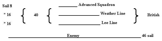 34 Nelson ezen a ponton hivatkozott eredeti széljegyzete: the Enemy's Fleet is supposed to consist of 46 sail of the line; British Fleet of 40. If either is less, only a proportional number of Enemy's ships are to be cut off; B[ritish] to be 1 superior to the E[nemy] cut off.