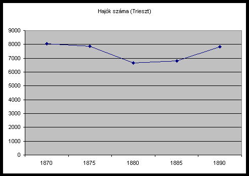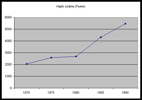 Megjegyzés: Az adatokból jól látható a fiumei kikötő forgalmának gyors növekedése, valamint Trieszt vezető szerepe. A kikötőkbe érkezett hajók számát mutató grafikon szemléletesebben mutatja Fiume gyors fejlődését. A két kikötő áruforgalma között a hetvenes években még lényeges különbség látható, míg a kilencvenes évekre a differencia jelentősen csökkent. |