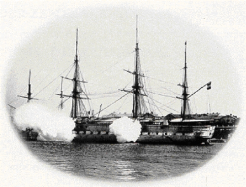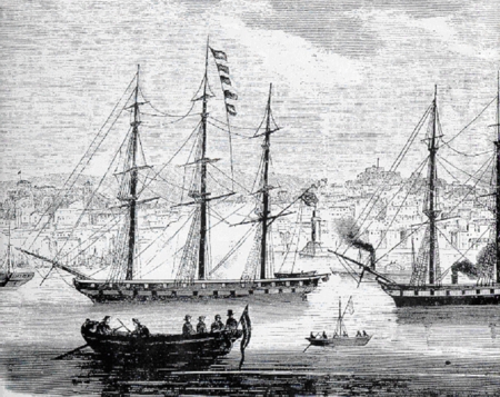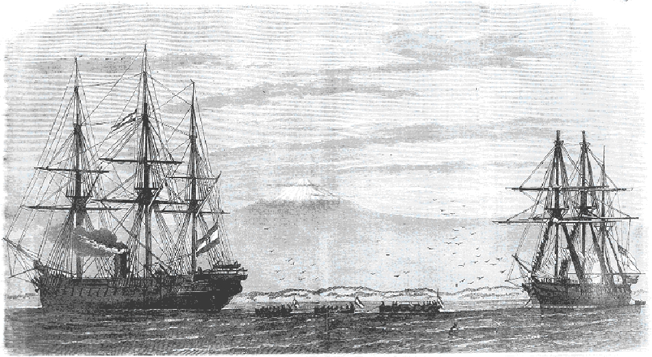 A Novara, balra, Vera Cruzban átveszi Maximilián császár holttestét. A HMS Niger a kép jobbszélén horgonyon áll. Az Illustrated London News metszete.Klikk a képre!