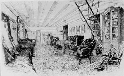 A Novara parancsnoki kabinja 1857-ben. Joseph Selleny eredeti ceruzarajza nyomán.