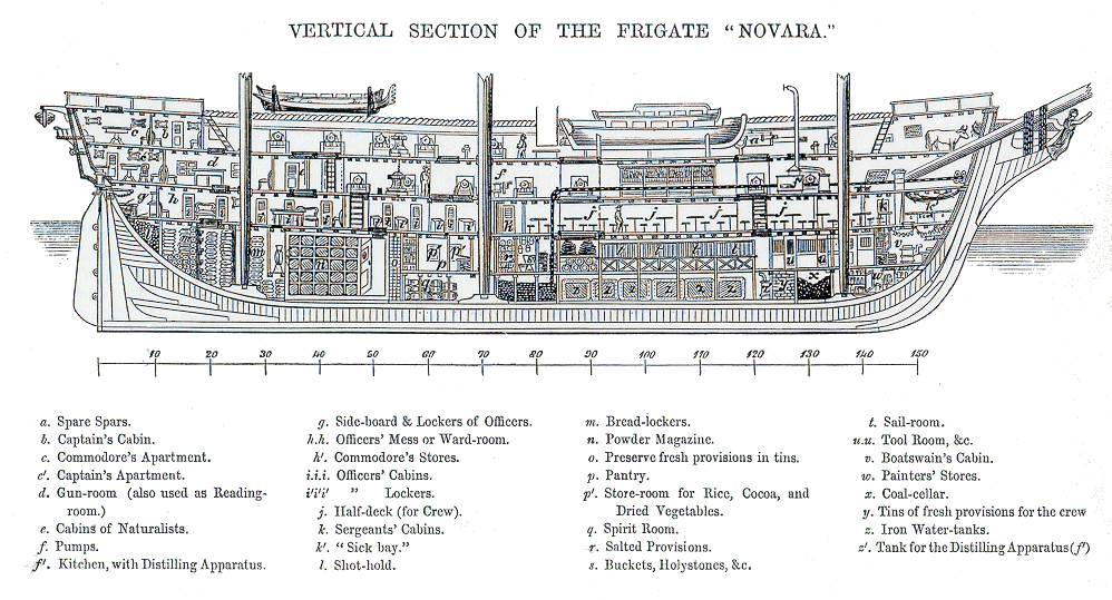 A Novara osztrák fregatt hosszmetszete az 1857-1859-es világkörüli útja idejéből. Kivonat Scherzer úti beszámolójából (1861-63).Klikkeljen a képre!