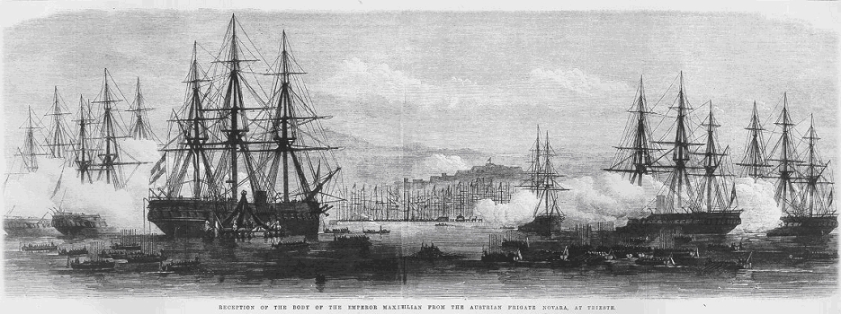 ----, 'Embarkation of the Body of the Late Emperor Maximillian at Vera Cruz, Mexico', The Illustrated London News, 11 January 1868, 32. [Includes an engraved view featuring the SMS Novara and HMS Niger]
