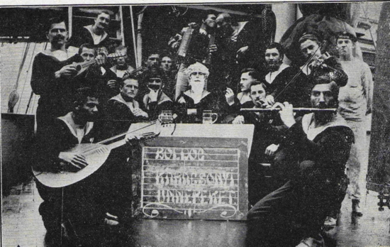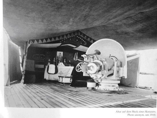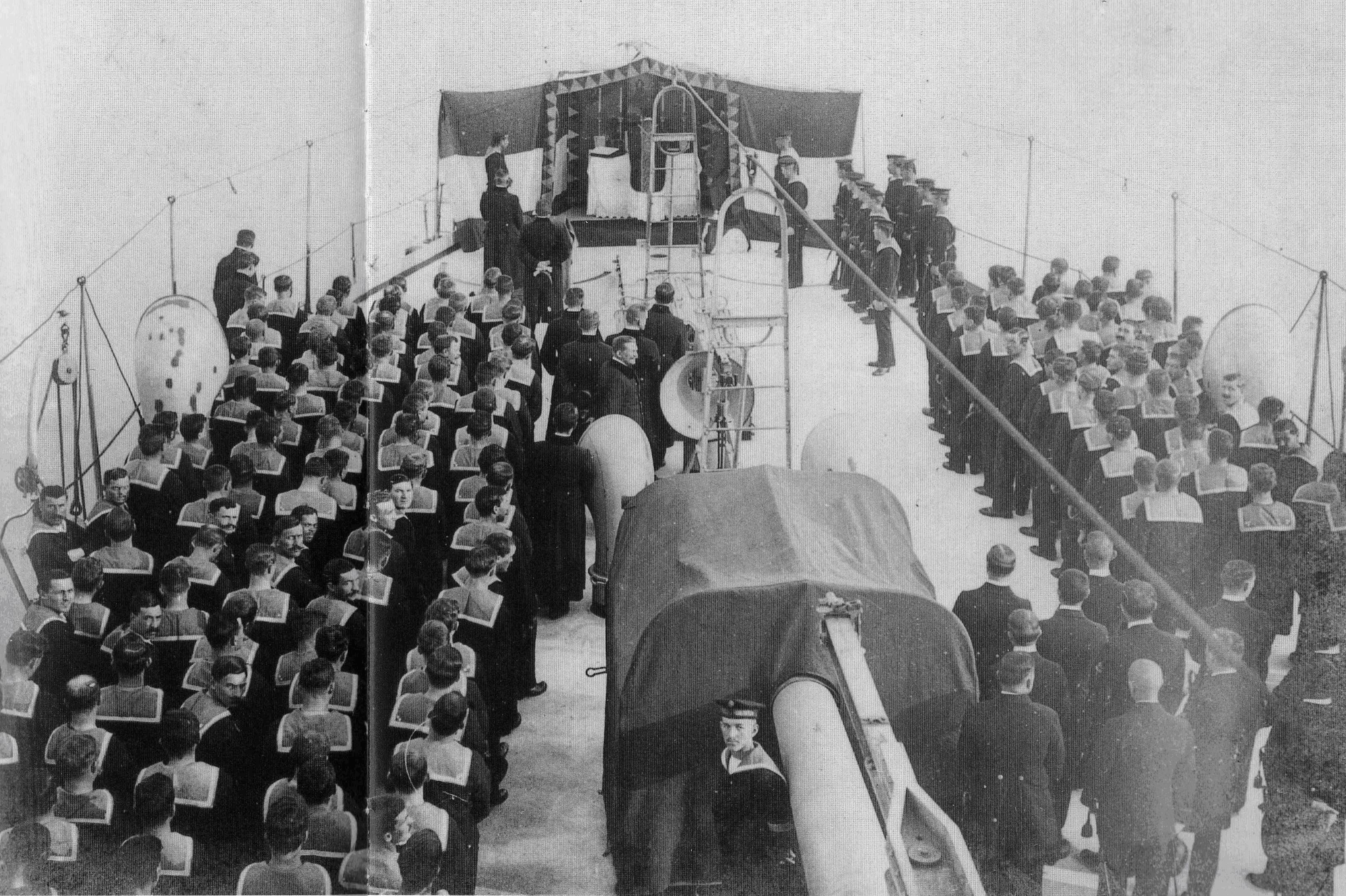 Istentisztelet. A taton a K.U.K. felségjelvényét megjelenítő drapériákból kialakított szentéj, előtte az oltár látható. Megfigyelhető a legénység és a tisztikar elkülönülése. Kép forrása: DIETER WINKLER ALBUM. 1997. 111. o. (1914)