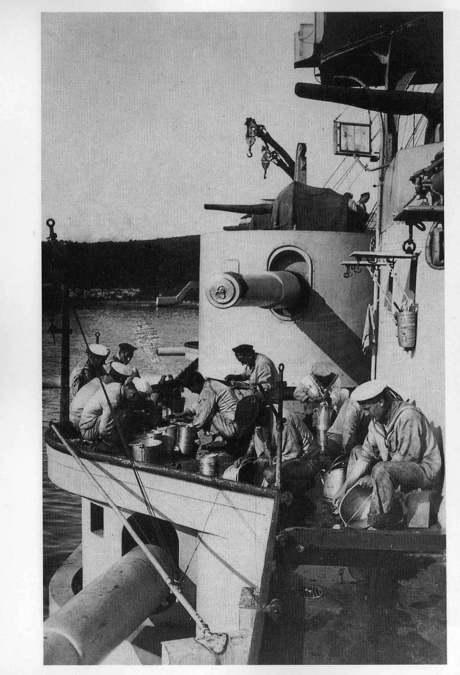 Presztízs, versengés a flották között Ennek megértésére vegyünk egy egyszerű esetet a sok közül: Beyrut kikötője (1914, amikor az SMS Viribus Unitis, SMS Tegetthoff, SMS. Zrínyi és torpedóhajóik indultak cirkálóútra): "...egy francia, és egy orosz hadihajó vesztegelt ott. Mi annak rendje és módja szerint kikötöttünk, gyönyörűen, katonai fegyelemmel végeztük a horgonyok leeresztését, hadd tanuljanak tőlünk a francia, és orosz tengerészek, akik az egész horgony leeresztés alatt nem vették le rólunk a szemüket".[53] Ezután Alexandriában: "összehasonlítottan a mi tengerészeinket az Alexandriában látott francia, orosz tengerészekkel. Büszkén mondhatom, hogy míg nálunk délután is végzett munkát a legénység, addig a francia és orosz hajókon csak délelőtt dolgozott, és már délután 2 órától zeneszó mellett táncoltak, szórakoztak. Nálunk minden nap mindenki munkaideje be volt osztva, még külföldön is. A francia és orosz hadihajón meglátszott ennek a félnapi munkának az eredménye. A egész hajó festése mindenütt szennyes, piszkos volt."[54] Átmeneti, de szintén presztízzsel bíró kategória a sport is. Itt főleg a ragettára, és a nemzetközi tengerész sportversenyek jelentőségére gondolok. A hajón a legénység több féle sportot űzhetett, a birkózástól atlétikáig. A kondíció megtartásán kívül ez a versengésnek is lehetőséget biztosított. Szabadidejükben játékkal (pl.: móra, tiltott tarakk), és amatőr zenekarokkal múlatták idejüket a fedélzeten.[55] Ünnepek, tengerészünnep; szakrális tér a hajón A következő részekre lehet bontani a szakralitást a fedélzeten. A mindennapi közösségi vallásgyakorlás, és hivatalos egyházi ünnepek (általában nemzetiségek szerint külön ünnepelt pl.: karácsony, újév, speciális, tengerészhagyomány diktálta formában),[56] temetés (hajóról, illetve szárazföldön). A hajón a hajólelkész (katonai plébános) a szertartások vezetője, a haditengerészeti plébánia, ill. a kerületi esperes alá tartozott rendeletileg (1887. szolgálati szabályzat 23.§ által) meghatározott módon, akit az apostoli tábori helyettestől kap lelkészi jurisdictiot.[57] Ezen felül meg kell említeni a tengerészünnepeket, mint pl.: a "félidő", és az utolsó "100 (még szolgálatban eltöltött) nap",[58] illetve a vegyes (főleg dalmát,) nemzetiségek hiedelemvilágából összeállt roppant érdekes hiedelemrendszert.[59]