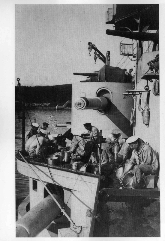 Étkezés ütközetállás alatt. Az étkezésről szóló cikkben részletesebben kitérek a legénység, a tisztikar ellátmányára, annak előállítására, szétosztására. Ez a három a bevezetésnél említett perióduson belül, valamint az egyes típusok sajátosságai alapján is változott. Egy torpedóromboló és egy csatahajó is más körülményeket biztosított. Míg a nagyobb egységeken önálló üzemekben állították elő az ételeket, azt ki lehetett a zsold rovására egészíteni a kantinból, addig egy kicsi rombolón korlátozottak voltak a lehetőségek, legtöbbször konzervételek álltak a rendelkezésre. A menü tápértékének meghatározása mind a három periódusban igyekezett a lehetőségekhez képest kiszolgálni az igényeket szakmák (igénybevétel) szerint, figyelembe véve az évszak, időjárás, és éghajlati öv sajátosságait.